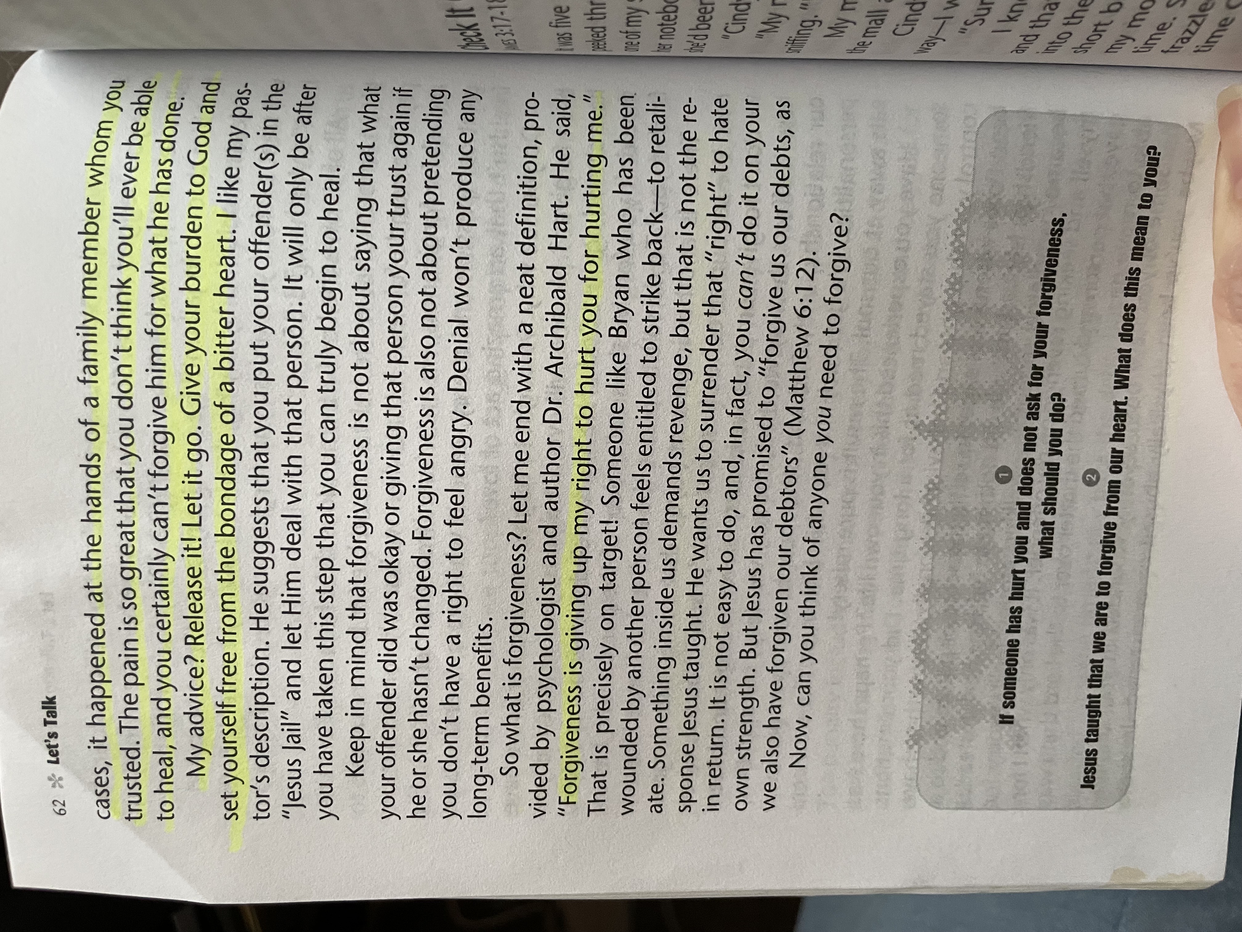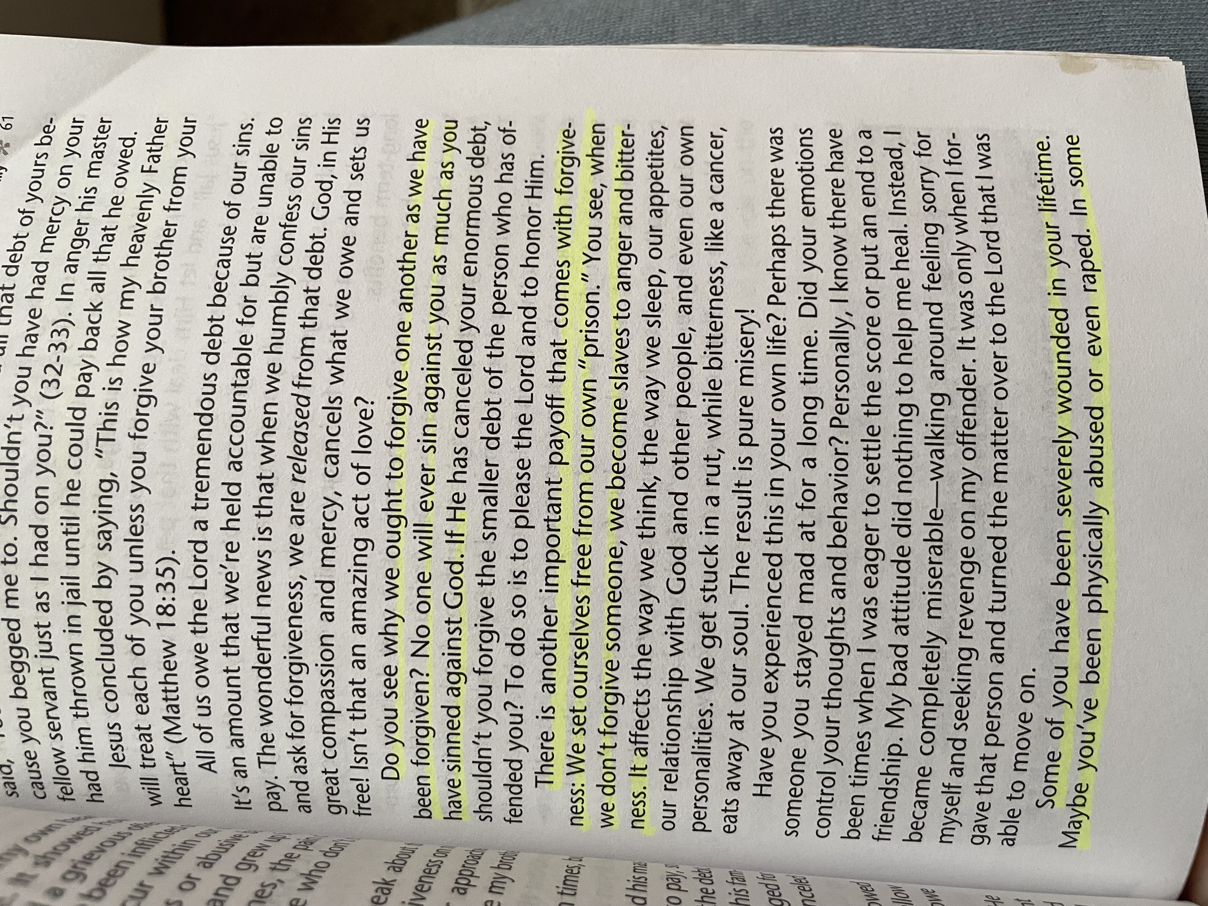 Forgiveness. It’s a word deeply embedded in the minds and hearts of children who grew up in religious authoritarian families and church communities. Children are told they were born with a crushing debt of sin to God and the only way to be “clean,” whole, pure, and happy was to admit their sin and ask God for forgiveness. This is the evangelical gospel in a nutshell, and it plants the seeds for abusers to exploit the vulnerable at every turn. Religious communities teach vulnerable young people the supposed goodness and moral superiority of forgiving those who have wronged you, just as Christ forgives individuals. For many of us who grew up in religious authoritarian parenting homes, forgiving perpetrators of abuse became an act of faith in Jesus. To illustrate this, let’s look at a devotional that was written for evangelical tweens and teens by Danae Dobson, daughter of James Dobson himself.