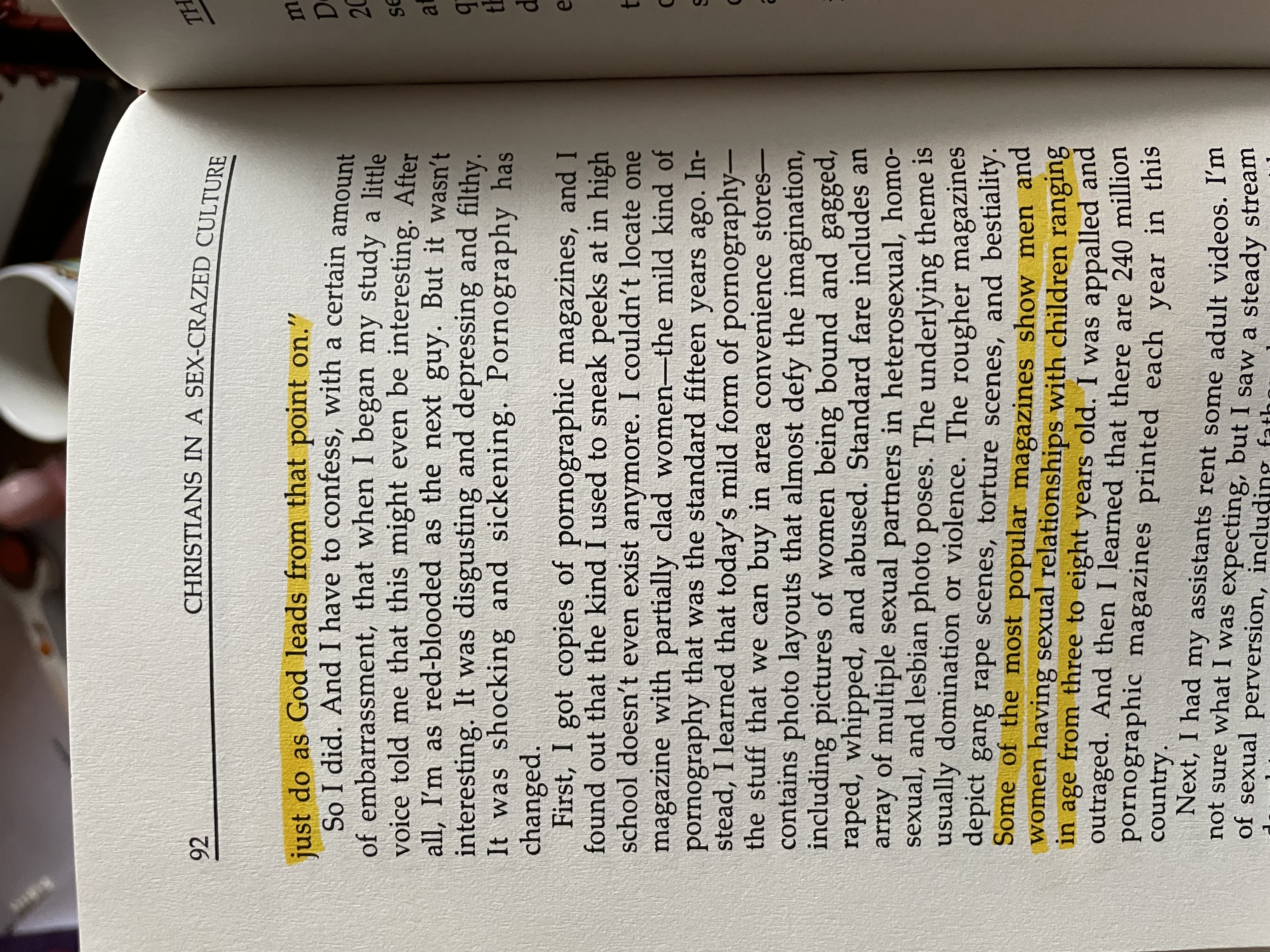 “Some of the most popular magazines show men and women having sexual relationships with children ranging in age from three to eight years old. I was appalled and outraged. And then I learned that there are 240 million pornographic magazines printed each year in this country. Next, I had my assistants rent some adult videos. I’m not sure what I was expecting, but I saw a steady stream of sexual perversion, including fathers having sex with daughters, sons with mothers, siblings with each other, adults with children, and children with children. And sales of these adult videos are going off the charts.”