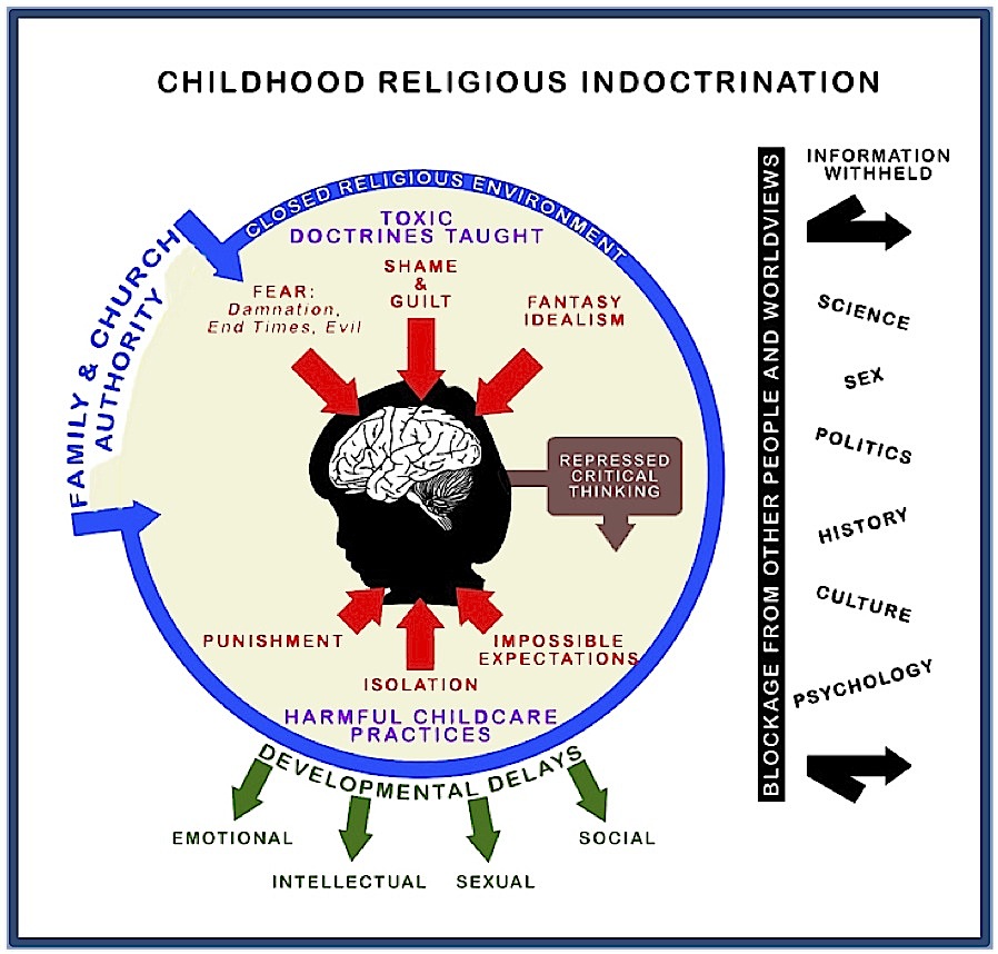 Furthermore, the ideological system promotes unquestioning and instantaneous obedience, and even teaches explicitly that obedience is the same as love. Children, who want to love and want to be loved, learn to obey in order to get attachment needs met. The religious system takes these dynamics beyond simply parent-child dynamics, and makes a child feel that their eternity is at stake, based on whether or not they obey and adopt their parents’ values.